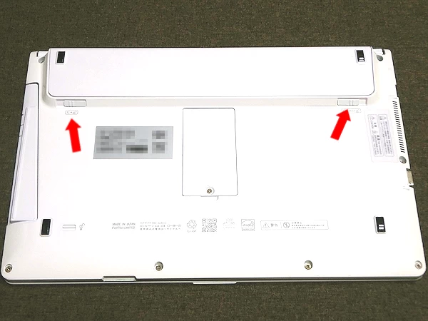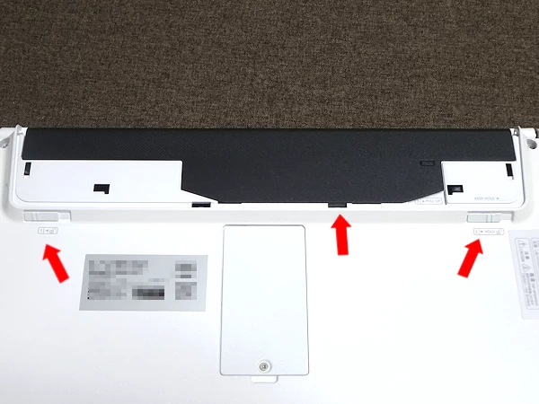 最初にバッテリーパックのカバーを開けます。左右のロックを解除しながらカバーをスライドさせて開けます。
