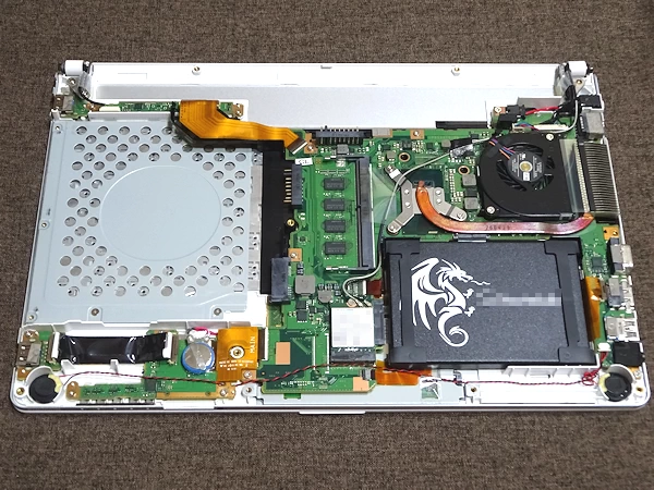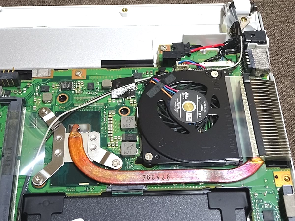 ファンとヒートシンク部分です。ヒートシンクのグリースが劣化すると、処理が遅くなったりファンが常に回っているような状態になります。