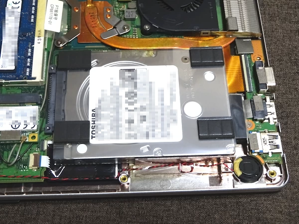 2.5インチHDDが搭載されています。SSDなどに交換する場合、カバーは再利用するので慎重に剥がします。 カバーは両面テープで接着されています。