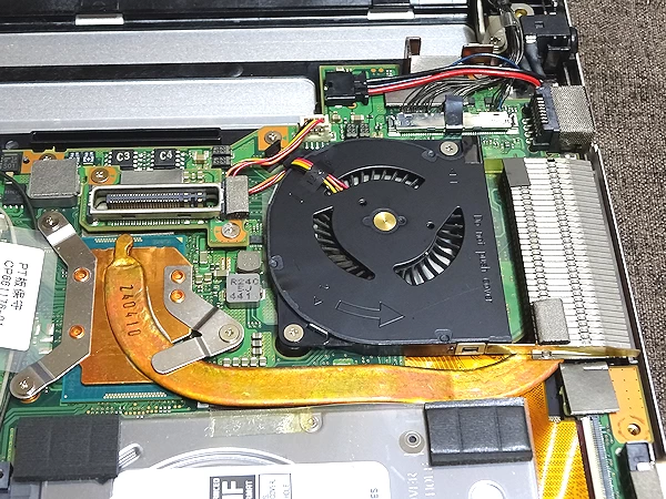 ファンとヒートシンク部分です。ヒートシンクのグリースが劣化すると、処理が遅くなったりファンが常に回っているような状態になります。