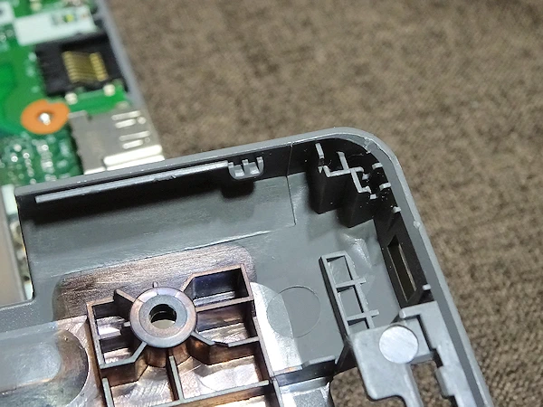背面カバーの周囲は、多数の爪で勘合されています。ネイルドライバー等で慎重に爪を外します。 強引に引きはがそうとすると、爪は簡単に折れてしまいます。